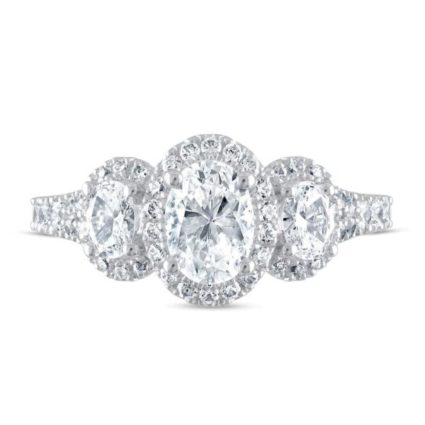 This spectacular three-stone engagement ring features dazzling oval diamonds haloed by round diamonds. Even more round diamonds add brilliance to the band, bringing the total diamond weight to 1 3/4 carats. Princess-cut sapphires, the signature of the collection and a symbol of faithfulness and everlasting love, are set into the ring bezel. The 14K white gold ring is a brilliant beginning to your romantic love story.