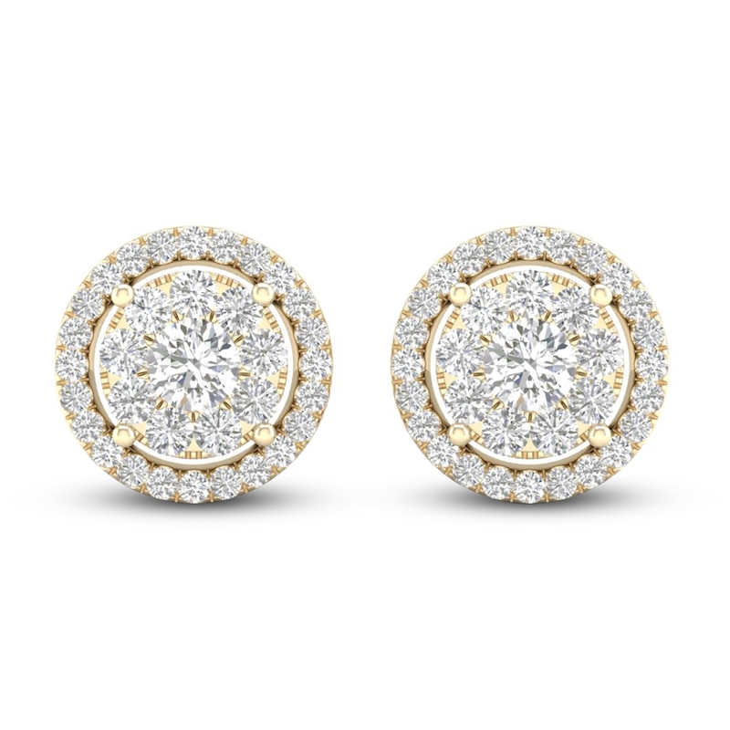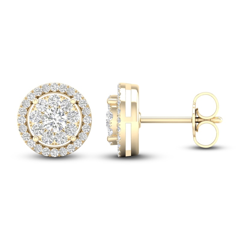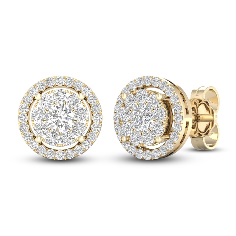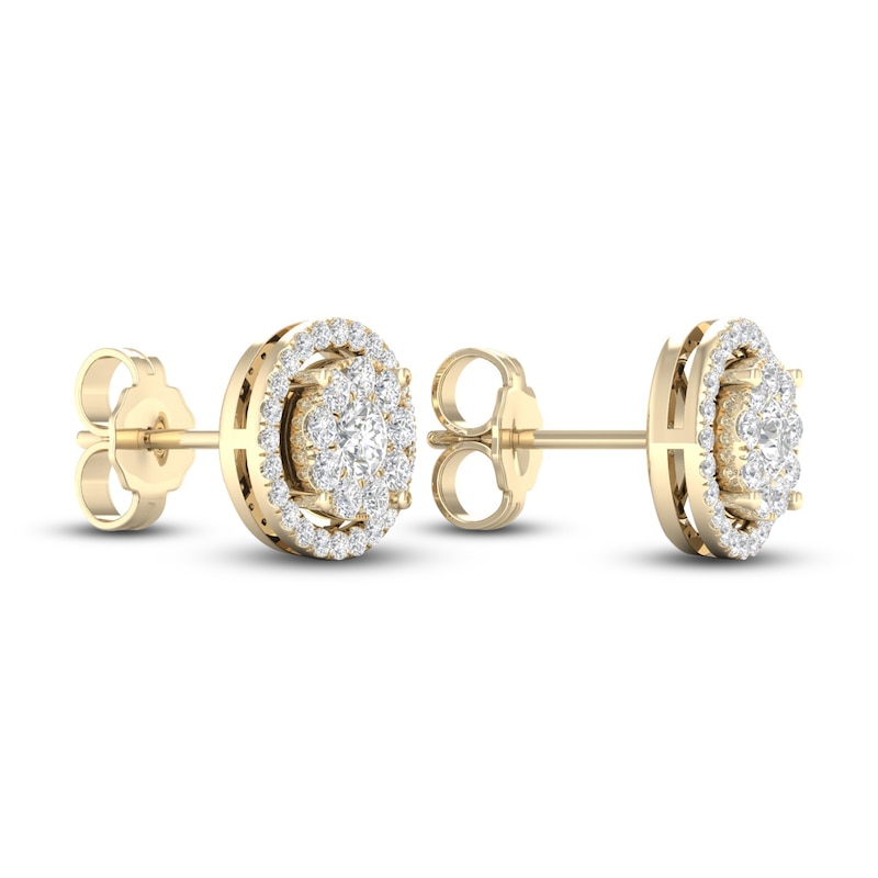 The graceful elegance of these diamond earrings will endure forever. Clusters of radiant round-cut diamonds create sparkling centers. Beautiful halos of more round-cut diamonds add extra shimmer and shine when set in iconic 10K yellow gold. The earrings have a total diamond weight of 1/2 carat and secure with friction backs.