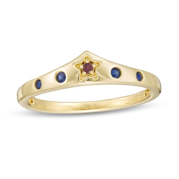 Crafted in warm 10K gold, this classic style is topped with a royal red star centered with a garnet. Bright blue sapphires set along the band add an eye-catching pop of color. Polished to a dazzling shine, this ring is a subtle reminder of your confidence and character.