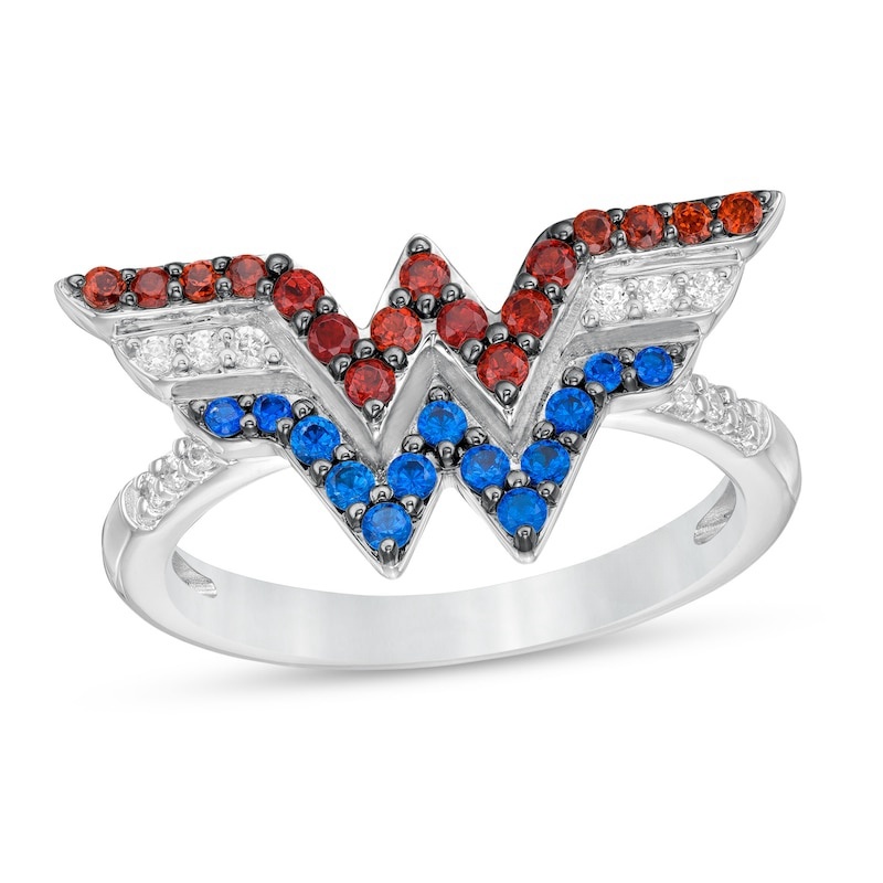 Garnet, Blue Sapphire and 1/15 CT. T.W. Diamond Symbol Ring in Sterling Silver