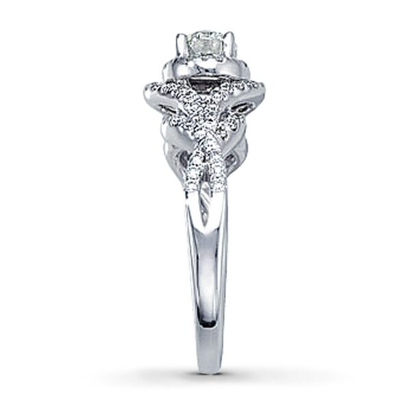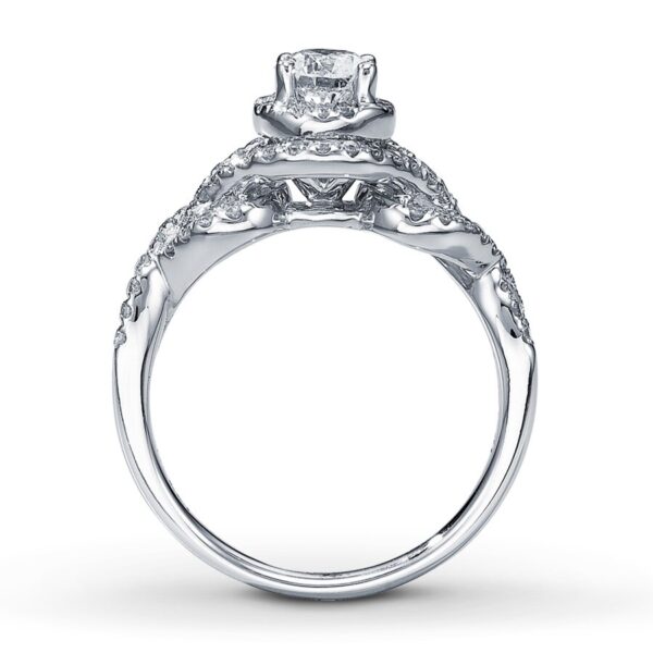 A captivating round diamond in this dazzling engagement ring will take her breath away. Additional pave diamonds in romantic twists of 14K white gold complete the look. This fine jewelry ring has a total diamond weight of 1 carat. Available online while supplies last.Jewelry is not eligible for in-store pickup.Jewelry may only be shipped either to your home address or to an alternate address.
